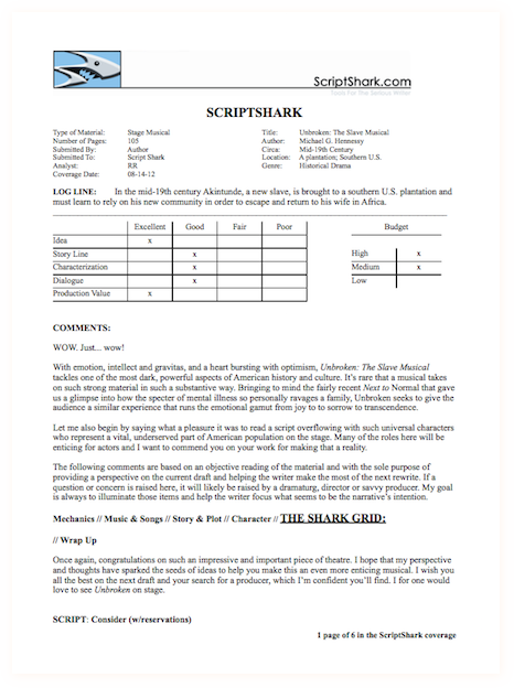 In 2012, we desired professional industry feedback on the work. We sent the libretto to the ScriptShark coverage service in Los Angeles. ScriptShark only uses the term "Consider" on the top 5% of the work they review. We were please to have earned their reccomendation.